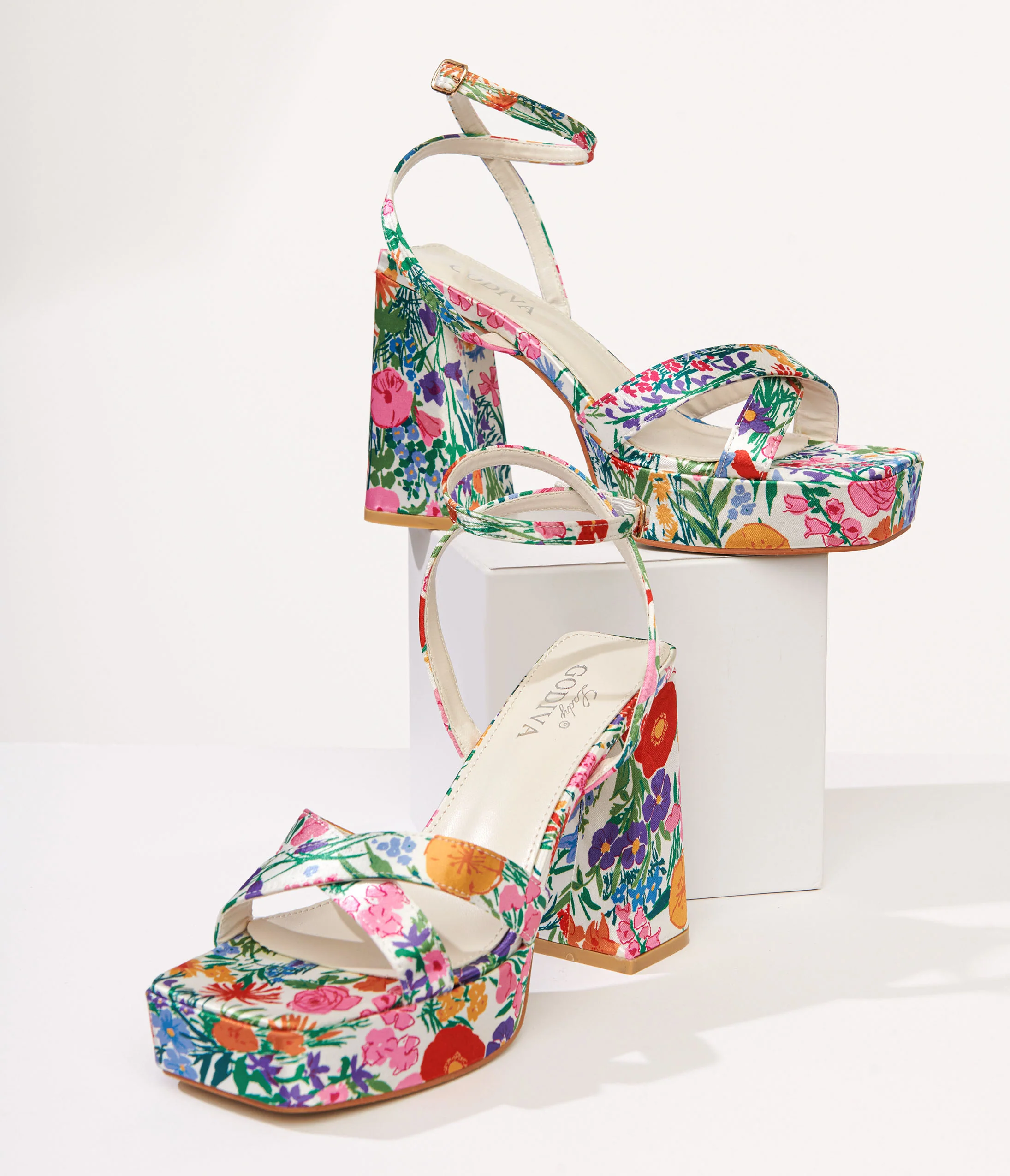These charming platform sandals feature a floral print on a classic white background, perfect for adding a touch of flower power to any outfit. The satin-like material and crisscross upper design give these platforms a unique and stylish look that will have you standing out from the crowd. With an adjustable ankle strap for the perfect fit, these sandals are as comfortable as they are cute. Complete with a 1.25 inch platform and 4.25 inch heel. Available while supplies last.