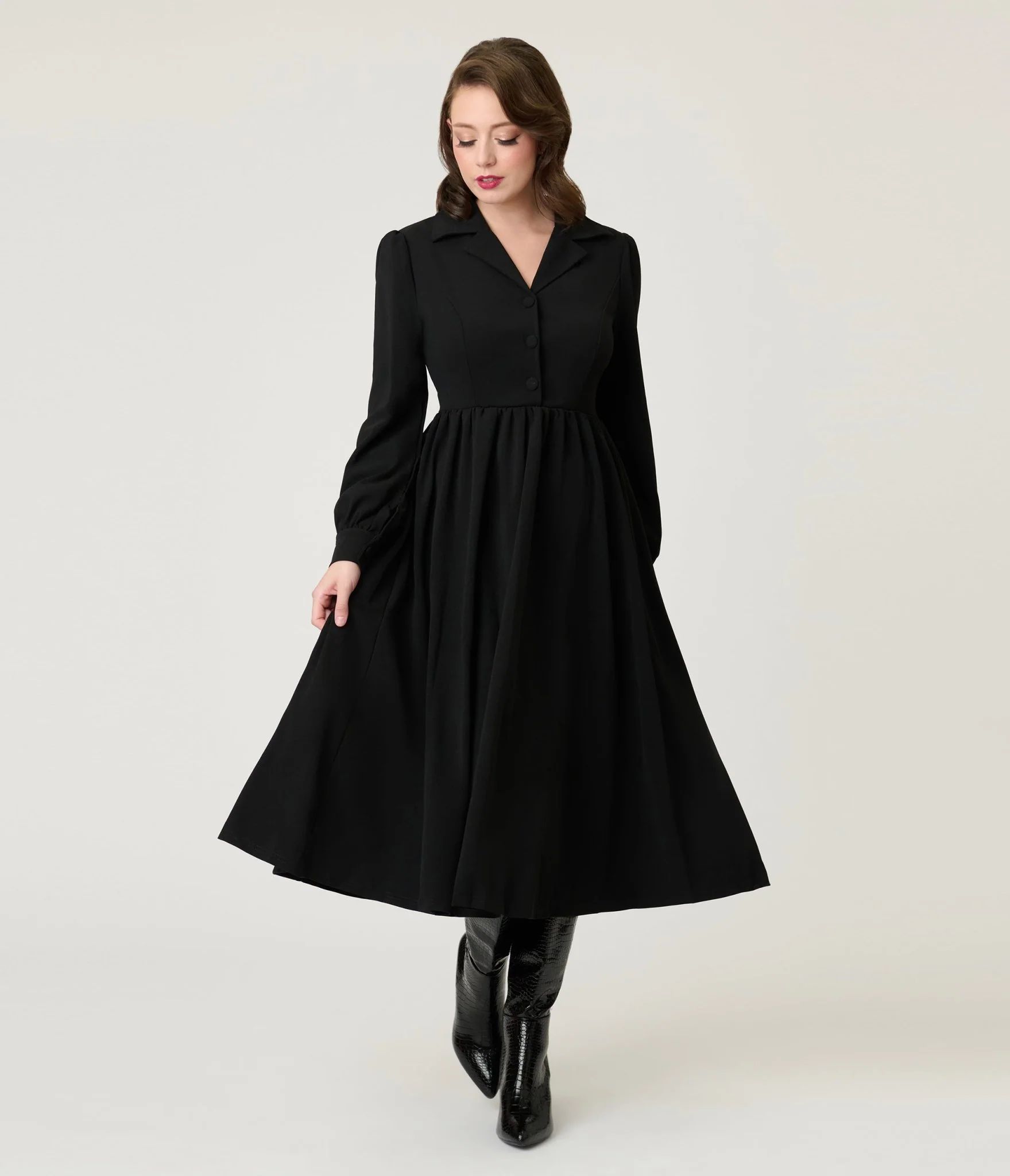 Step into the enchanting allure of our Black Long Sleeve Midi Dress, designed for those who embrace their inner witch. This captivating piece features a button front bodice that adds a touch of vintage charm, while the long sleeves provide an elegant silhouette perfect for any occasion. Whether you're casting spells at a soirée or enjoying a cozy evening out, this dress effortlessly combines style and comfort, making it a must-have addition to your wardrobe. Embrace your dark side and make a statement with this timeless classic.