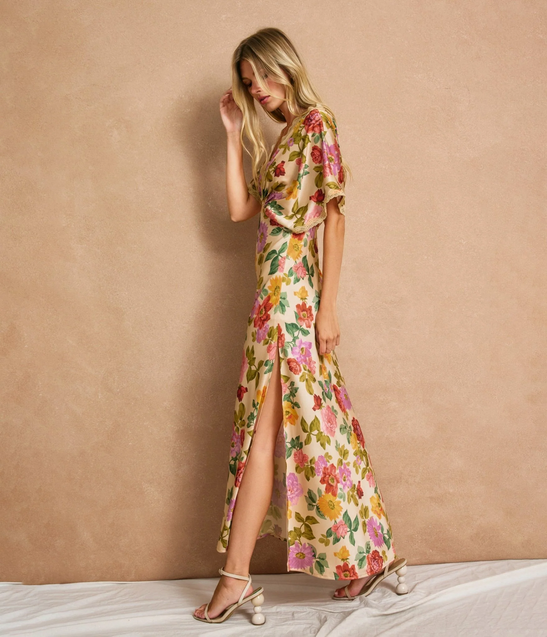 Embrace timeless elegance with our Champagne Floral Blouson Maxi Dress. This vintage-inspired piece features a delicate floral print that dances gracefully across the fabric, perfect for any occasion. The flattering blouson silhouette enhances your figure while providing comfort and style. Elevate your wardrobe with this enchanting dress that promises to turn heads wherever you go.