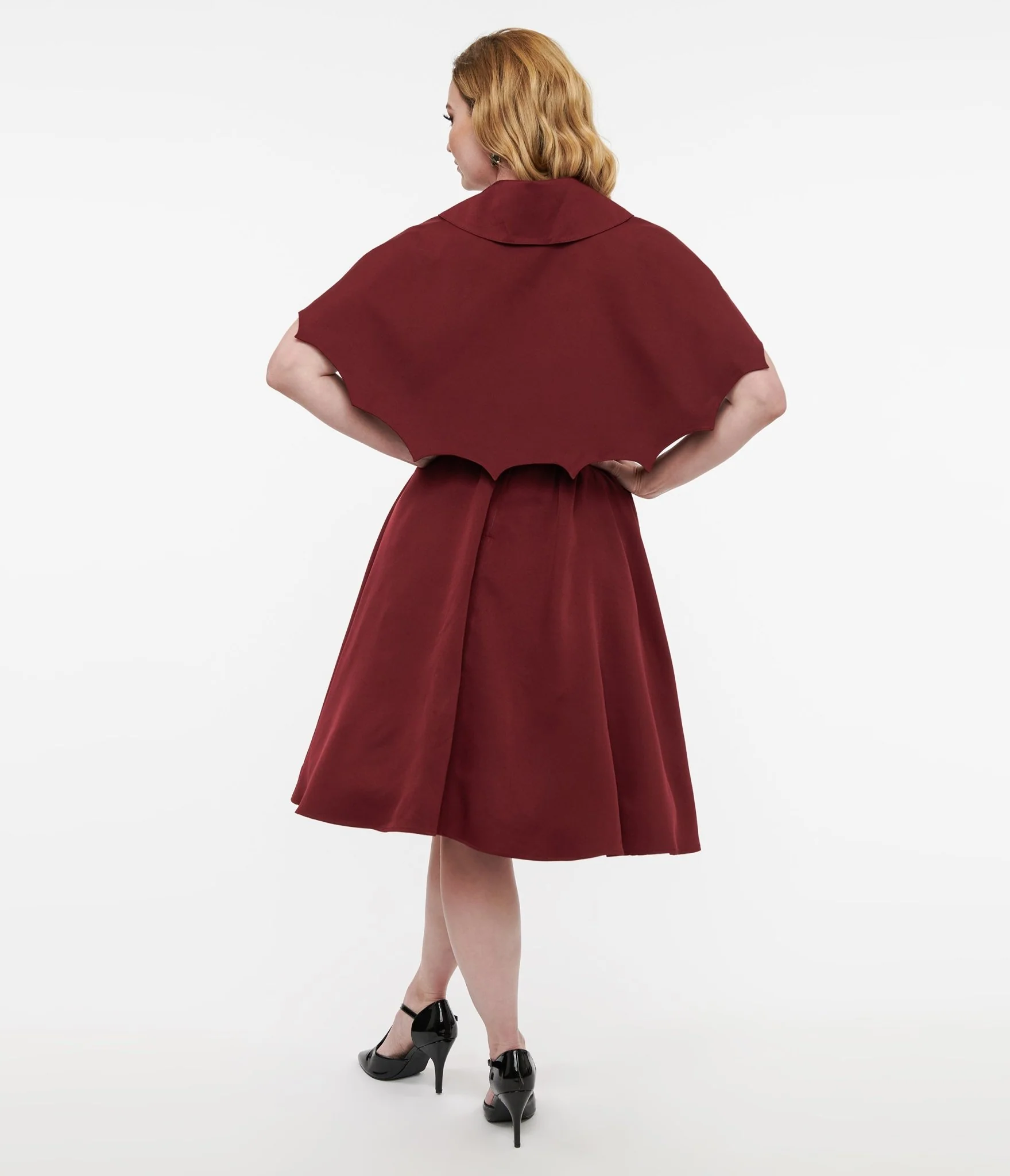 Fresh from Unique Vintage, in collaboration with Disney, this swing dress is crafted in a burgundy lightweight woven fabric. The sweetheart bodice is secured with flexible side boning while the waistband is cinched with a back zipper. The gathered swing skirt is outfitted with a chilling capelet, in a bat wing silhouette and grey plaid inside, covers your shoulders! Crinoline added for volume, sold separately. Available in sizes XS-5X while supplies last.