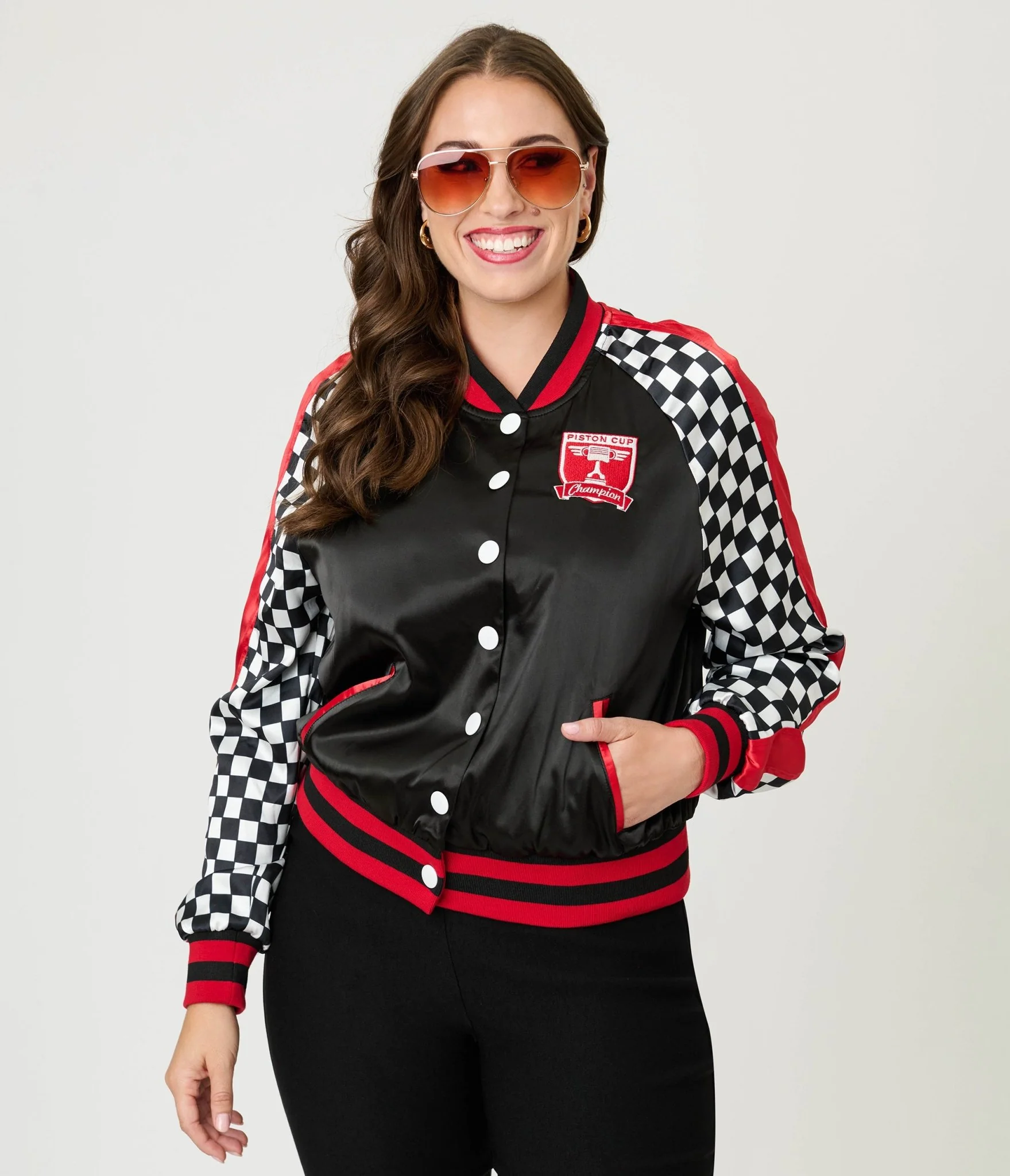 This beautiful bomber style jacket, in collaboration with Disney Pixar Cars and made by Unique Vintage, is crafted in a black satin-like fabric and boasting black and white checkered sleeves and red trim accents throughout. The snap front is offset by a Piston Cup Champion patch, while the back features a large screen print of the number 95 and the font Lighting McQueen. Complete with side pockets! Available in sizes XS-5X while supplies last.