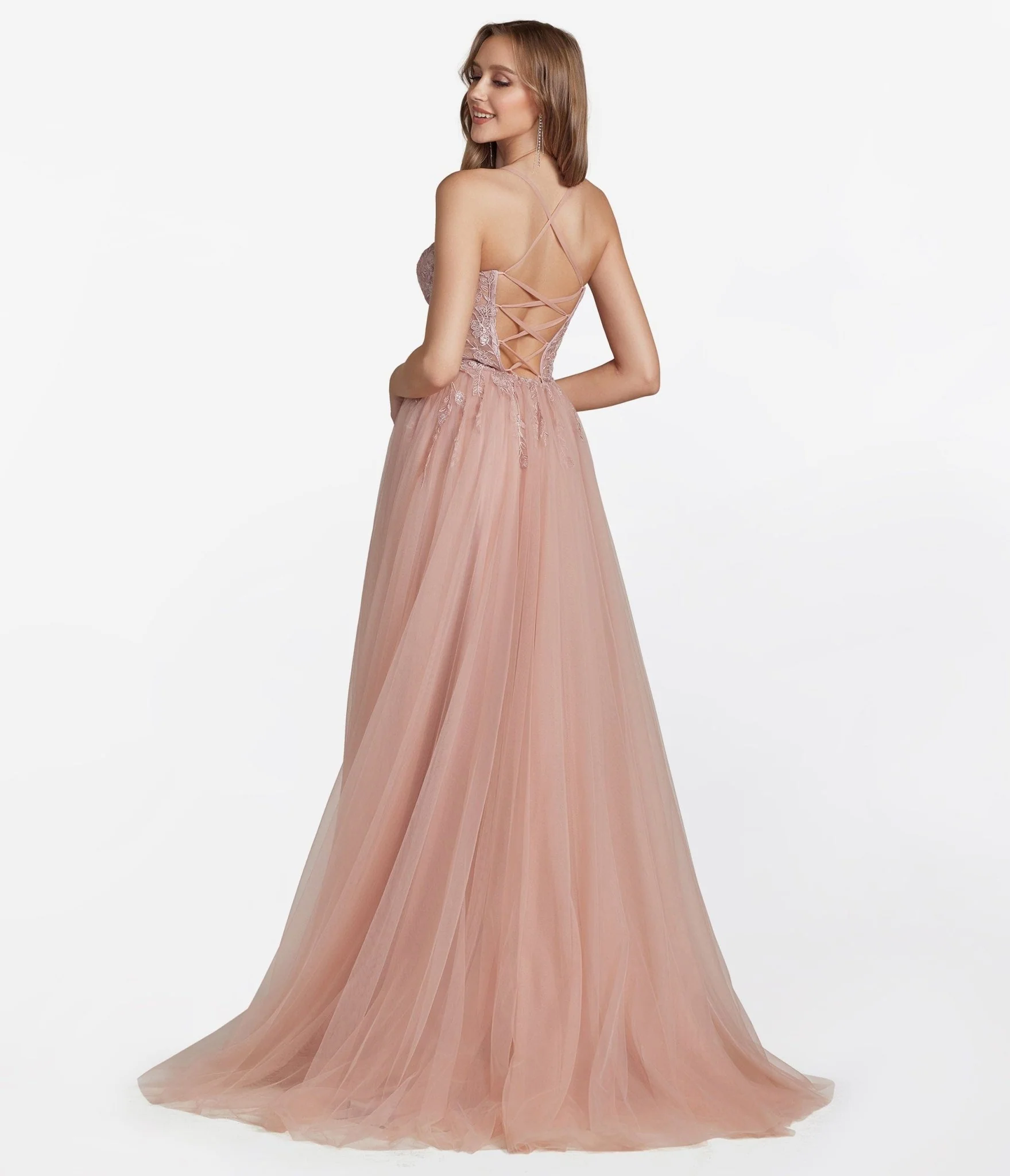 This long A-line prom dress is crafted in a gorgeous dusty rose colored tulle fabric, topped by a bustier-style sheer-lace corset bodice with thin shoulder straps that criss-cross the open back. The romantic evening gown includes a multi-layered long skirt that gathers at the lacy waist before opening in a side slit and ending at the floor with a figure-flattering a-line shape.