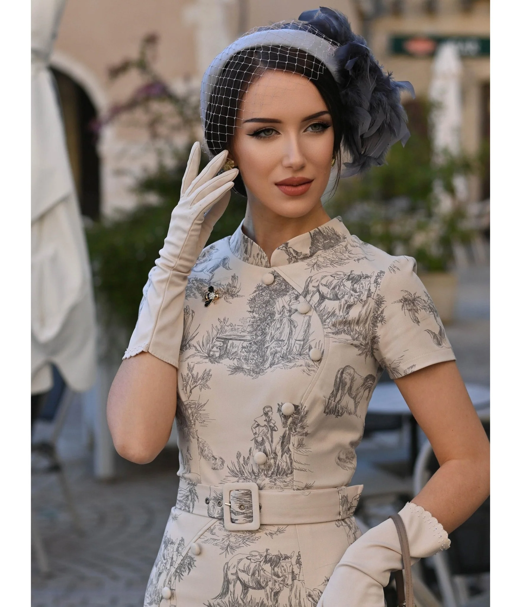 A gorgeous dress inspired from vintage design and cast in a dark cream Toile de Joy pattern. The front curve seam highlights your envious figure, while faux buttons down front creates the illusion of an hourglass figure. Complete with a pleat at front for easy walking!