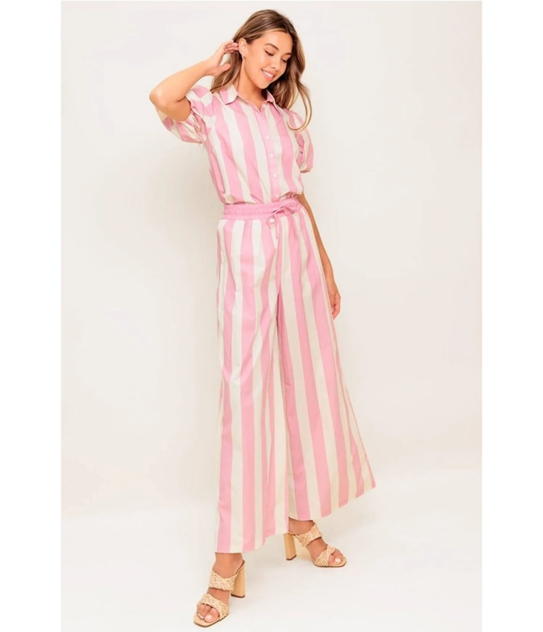 A pink and white striped printed woven top and pant set. Top featuring collar, short puff sleeve and button down. Pant featuring elasticized waist with front tie and wide leg