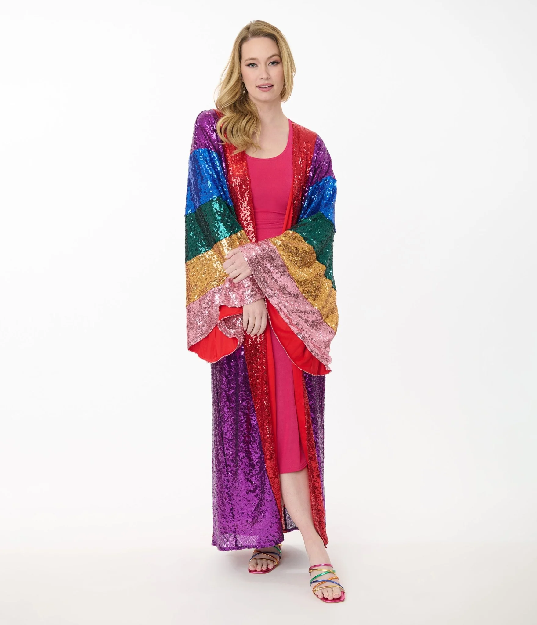 This eye-catching kimono is the perfect blend of retro charm and modern flair, featuring dazzling rainbow sequin stripes that catch the light just right. Whether youโre dressing up for a night out or adding sparkle to your everyday look, this kimono has got you covered!