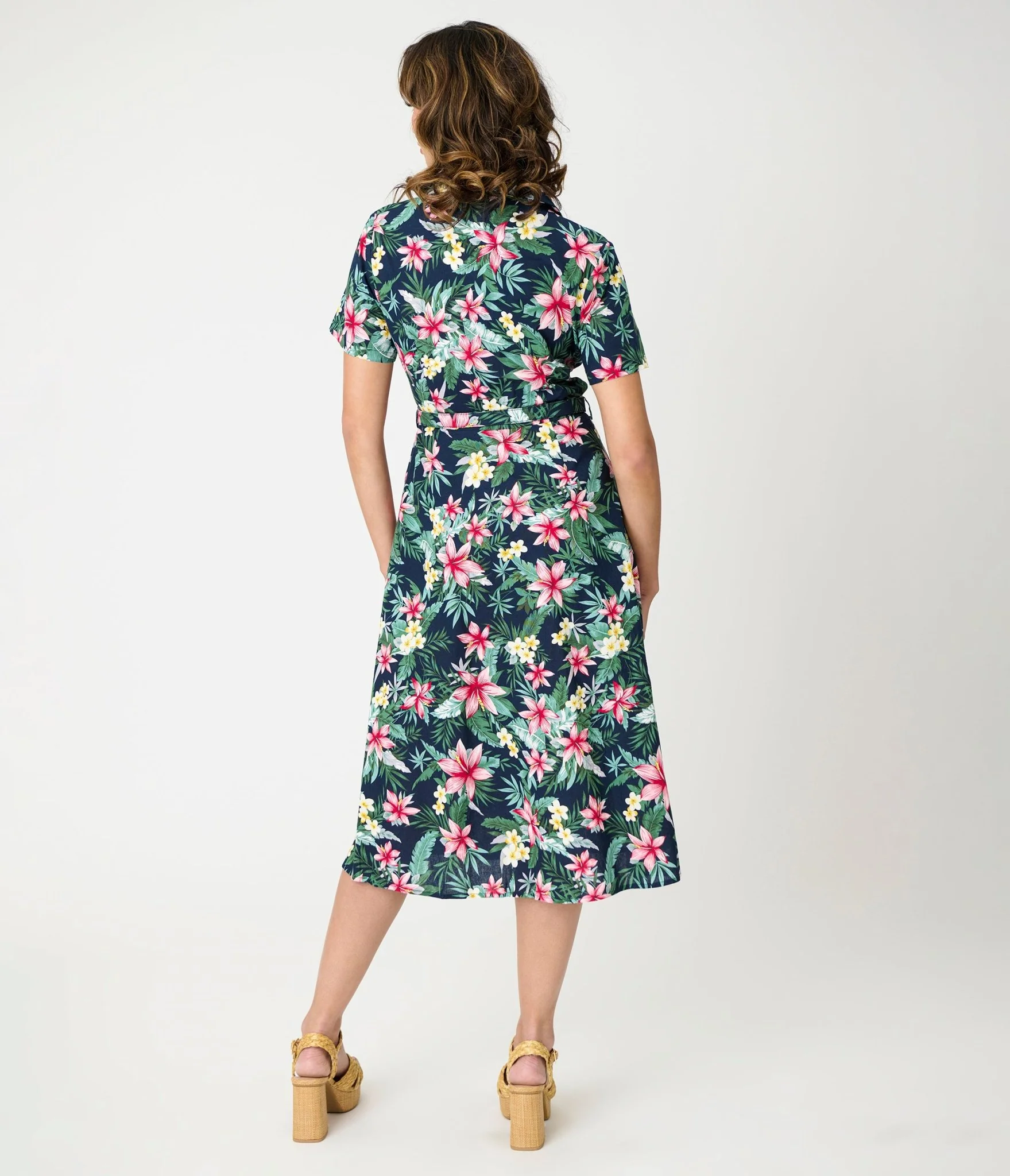 This vibrant swing dress is perfect for sunny outings, featuring a playful tropical print that brings a touch of vacation vibes to your everyday wardrobe. The front button-up design adds a chic twist, while the matching belt cinches your waist for that flattering silhouette. And let’s not forget those handy side pockets!