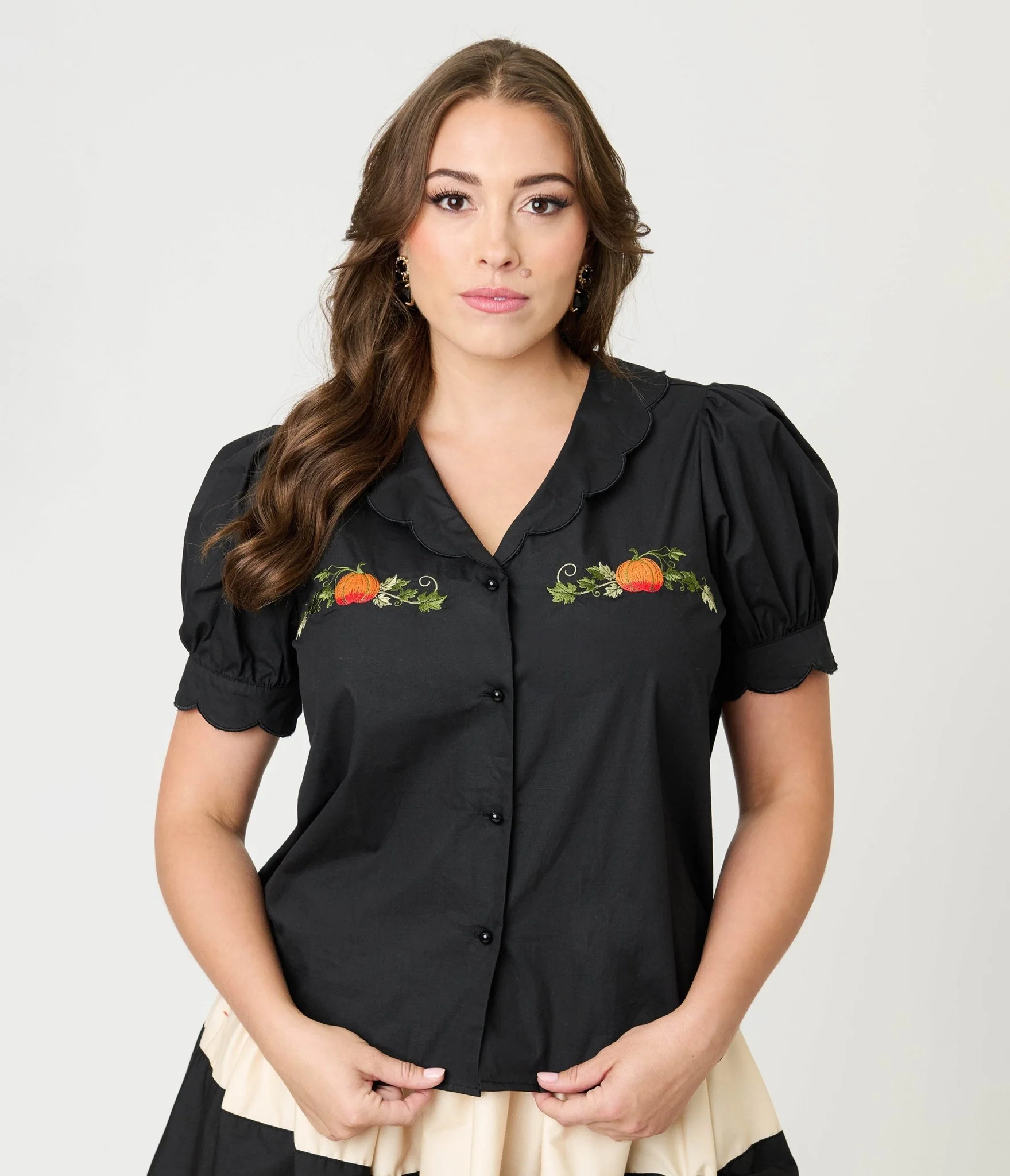This adorable black cotton blouse from Smak Parlour features charming short puff sleeves and a delightful embroidered pumpkin patch design that adds a sprinkle of magic to any outfit. Perfect for sunny days or cozy gatherings, itβs designed with a stylish front button-up closure that makes dressing up a breeze.