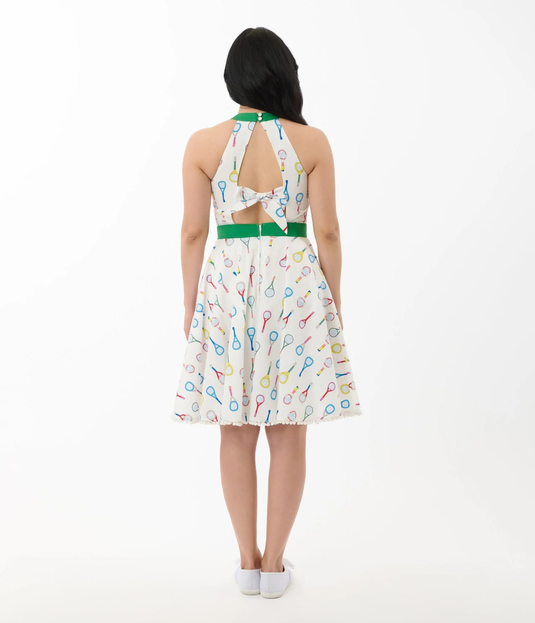 A retro flare featuring multicolor tennis rackets printed throughout the white backdrop crafted in a lightweight fabric. The halter style neckline is outfitted with a keyhole accent and buttons, while the back zipper nips in the pocketed flare skirt. Available in sizes XS-4X while supplies last.