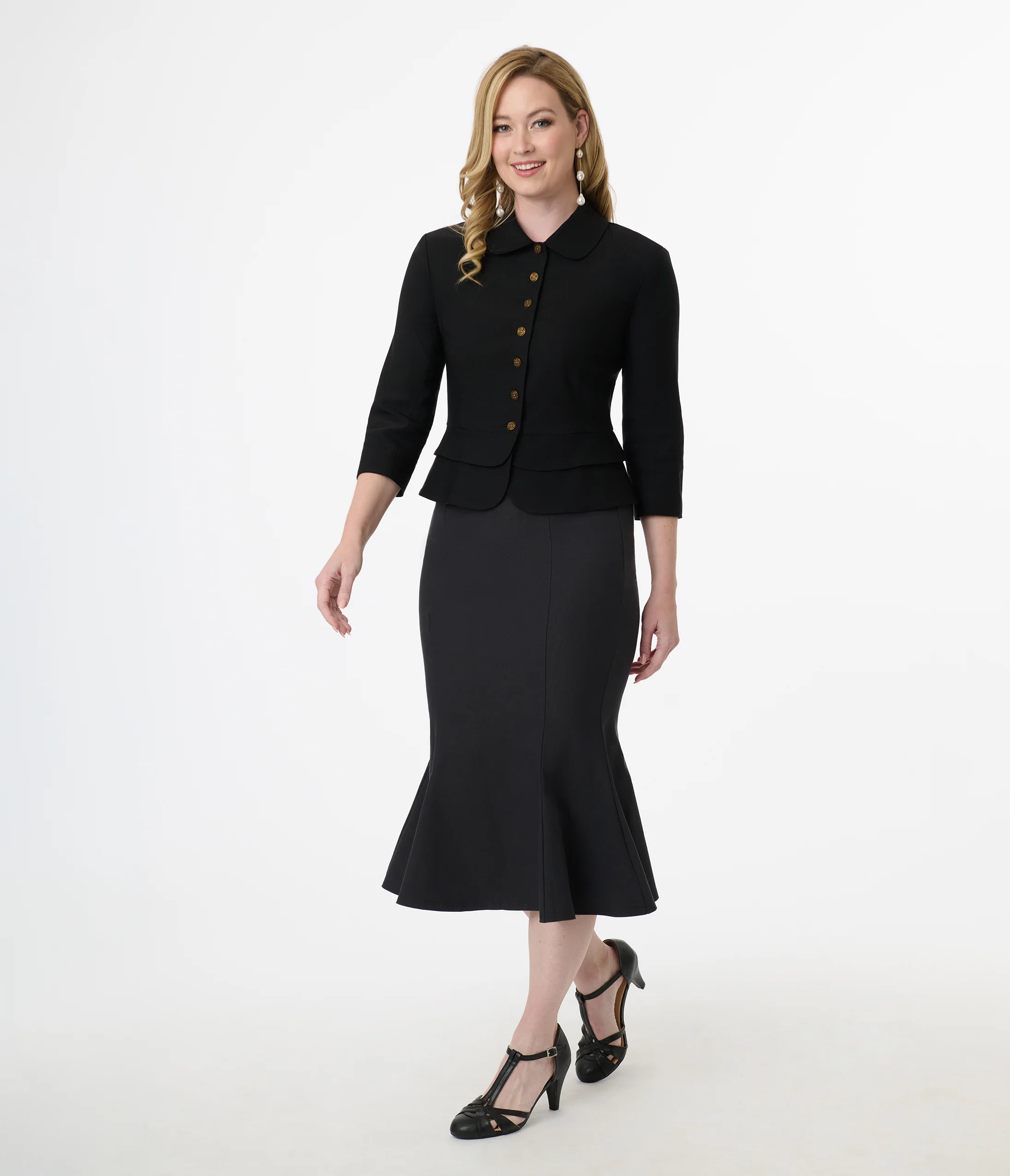 Crafted from a cozy soft stretch rayon blend, this black 1940s style jacket is perfect for making a statement. The playful peter pan collar and three-quarter length sleeves give it an effortlessly chic vibe, while the luxurious black satin lining ensures you feel as fabulous as you look. With its stylish front button-up design and flattering peplum silhouette, this jacket is your new go-to for both casual outings and dressier occasions!