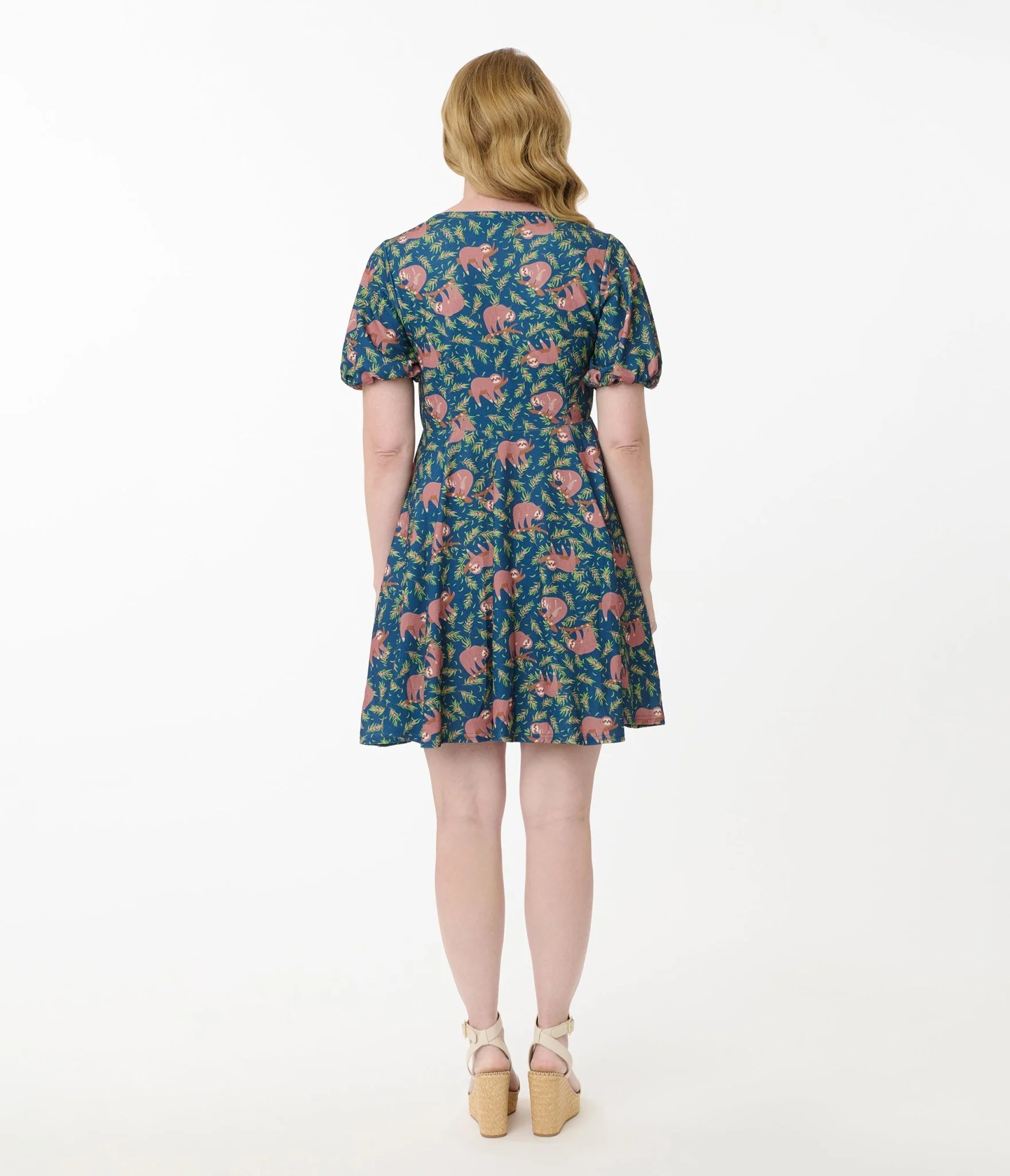 Unique Vintage Blue Summer Sloth Print Fit & Flare Dress