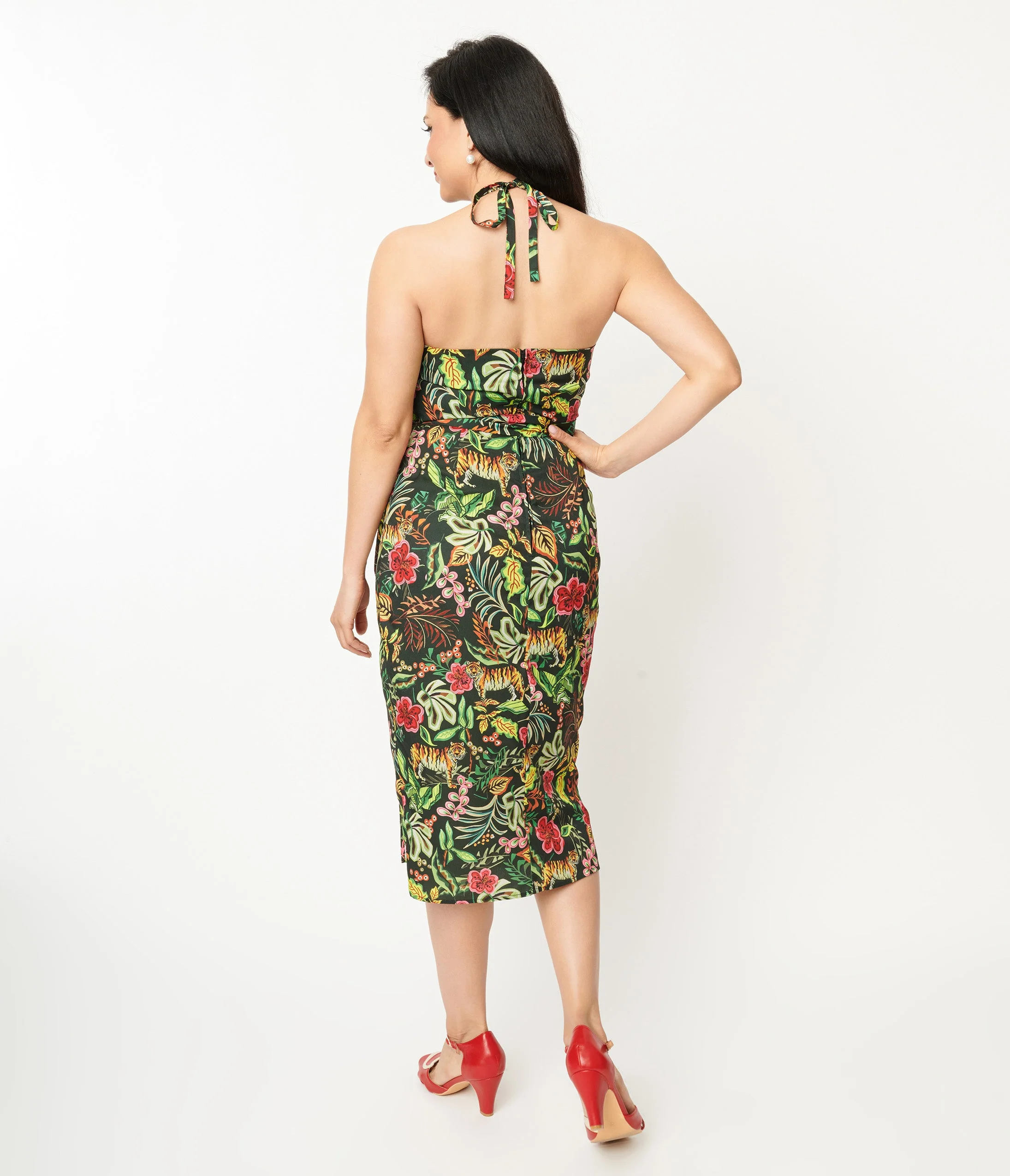 This striking sarong is crafted in a lightweight crepe that features tropical print with jungle cats prancing throughout the green backdrop. Outfitted with boning, adjustable halter, a faux wrap style with attached ties, and a side zipper. Available in sizes XS-4X while supplies last.