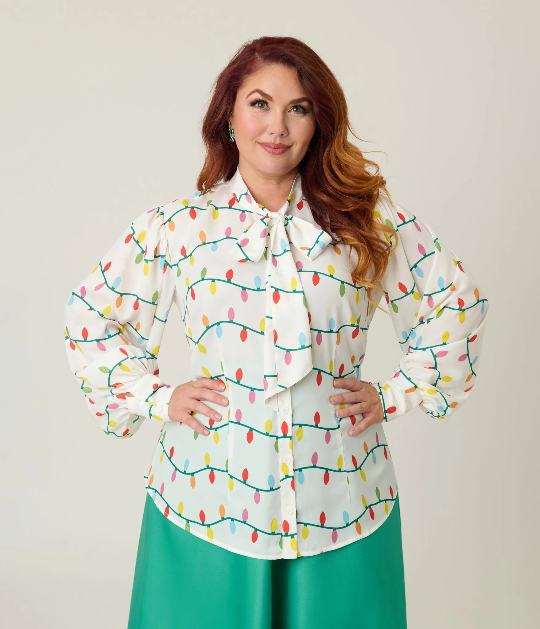 This elegant white Gwen blouse from Unique Vintage features a fun holiday novelty print of multicolor holiday lights. The long sleeves feature button cuffs while the self-tie necktie adds a touch of class and completes the look. Complete with a button down front.