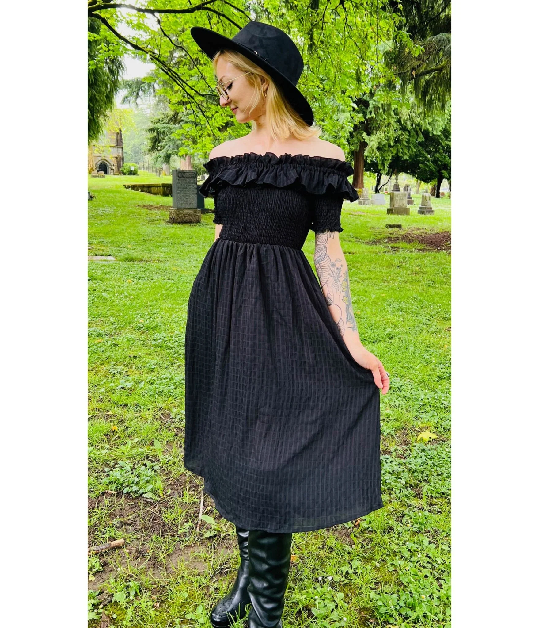 Wander deep into the woods in this stunning dress, a cottage goth daydream stitched for the modern forest witch. Made from a dark, lightweight, linen-like plaid fabric that whispers of mossy paths and forgotten spells, this fit-and-flare beauty features a smocked bodice for a touch of enchantment and all-day comfort. The ruffled neckline adds a dash of romantic drama, perfect for gathering herbs, summoning ravens, or simply sipping tea under a full moon. Earthy, eerie, and effortlessly magical.